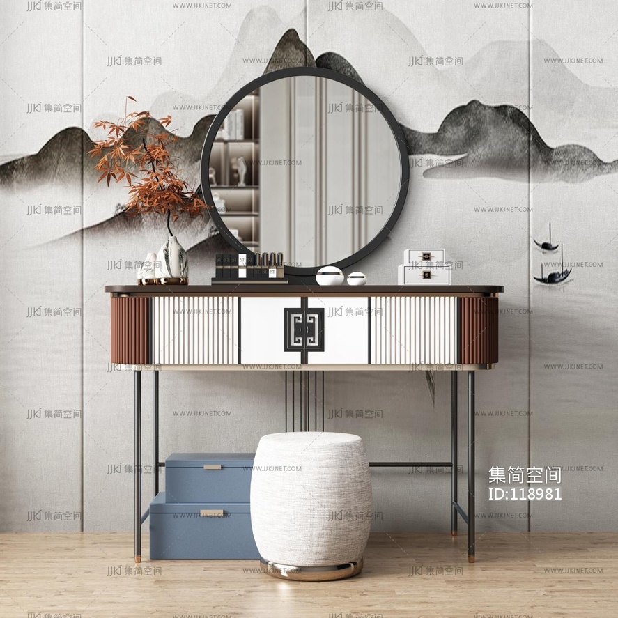 新中式梳妆台_山脉背景装饰墙 3d模型下载