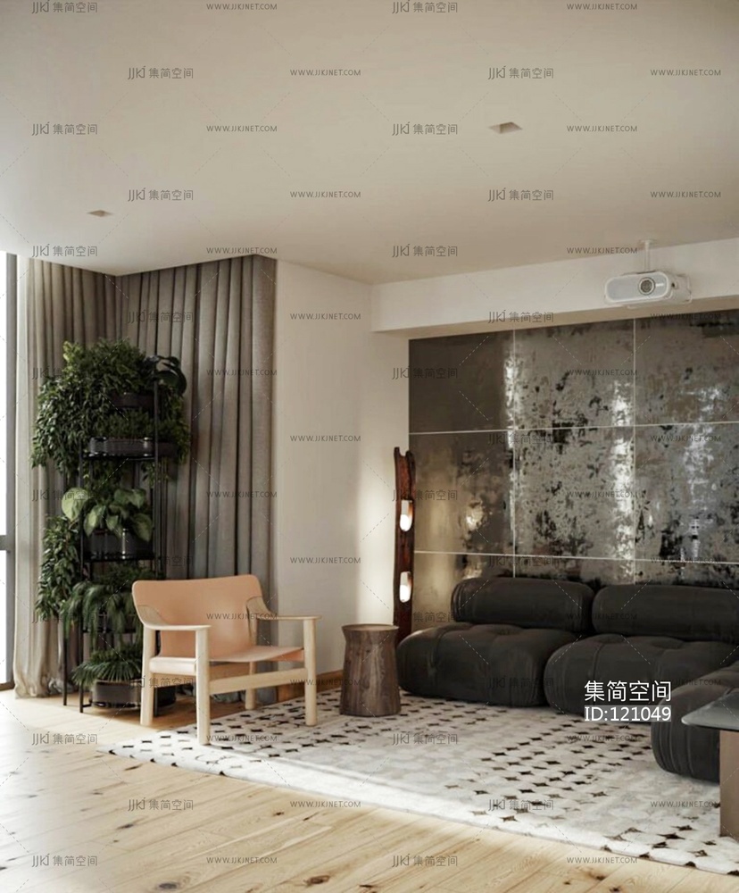 中古风客厅,美式客厅,圆形茶几,装饰画,移动电视,3d模型下载