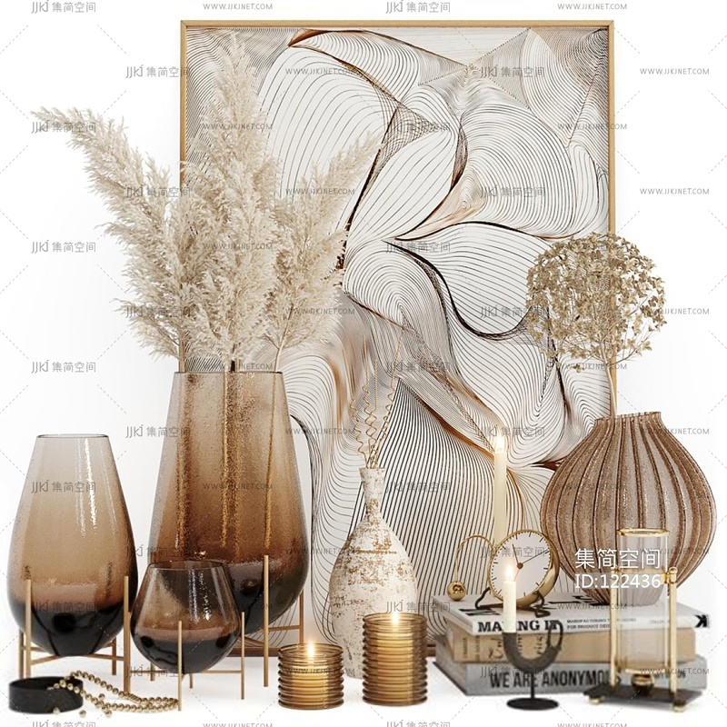 现代芦苇花瓶蜡烛摆件,玻璃花瓶 3d模型下载 [模型ID:122436]