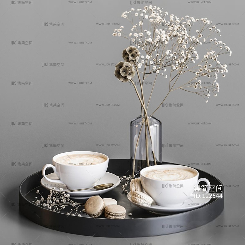 现代干花咖啡杯子摆件托盘 3d模型下载 [模型ID:122544]