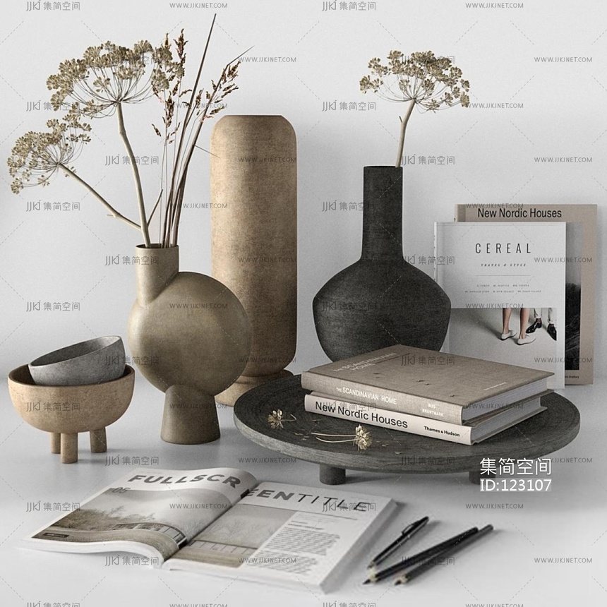 现代干枝花瓶书籍摆件杂志 3d模型下载 [模型ID:123107]