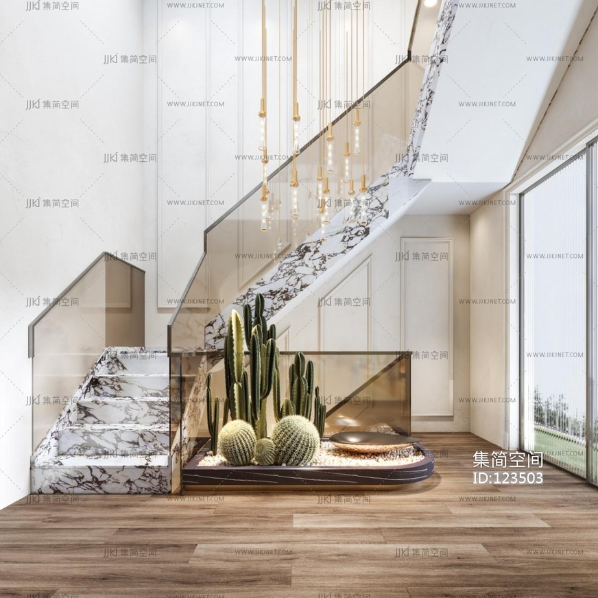 楼梯间,大型水景吊灯,盆栽植物3d模型下载