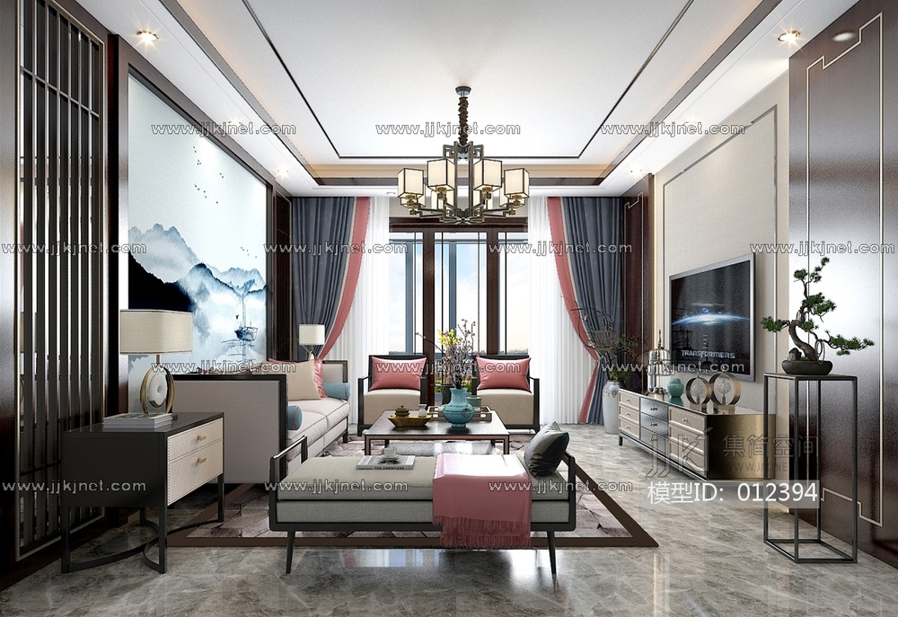 G03-01004新中式客厅新中式沙发茶几电视柜花架盆景 3d模型下载 [模型ID:12394]
