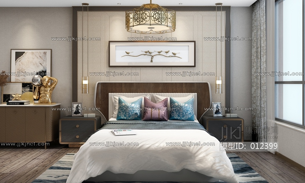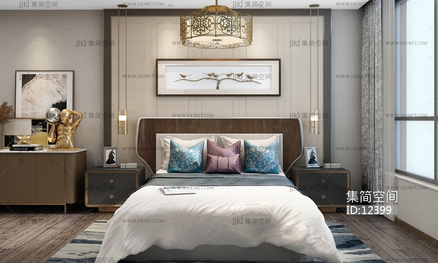 G12-01004新中式卧室新中式床吊灯 3d模型下载 [模型ID:12399]