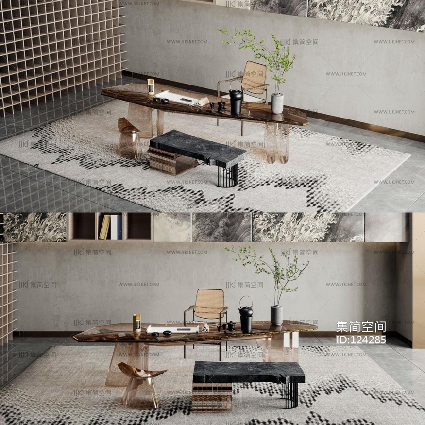 新中式茶桌椅,茶台,长条凳 3d模型下载 [模型ID:124285]