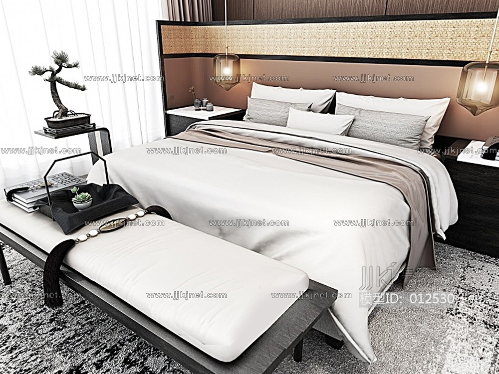 60新中式双人床卧室 3d模型下载 [模型ID:12530]