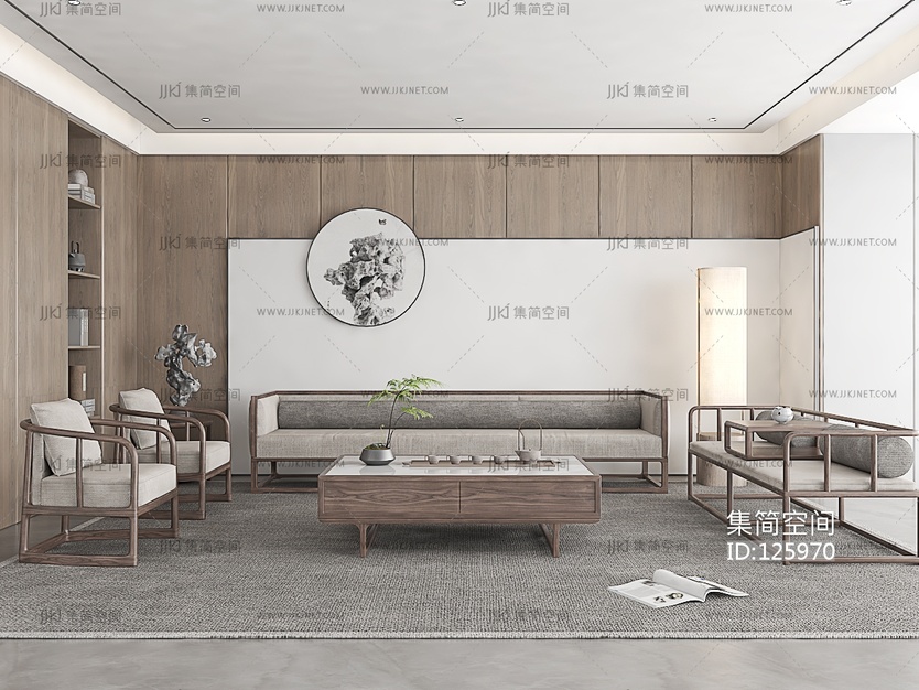 中古风客厅 沙发茶几组合 背景墙3d模型下载