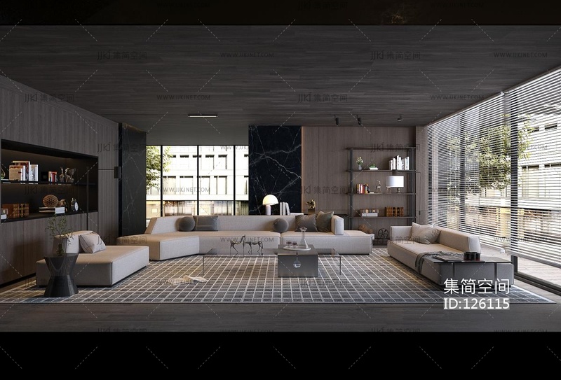 现代客厅布艺转角沙发茶几铁艺书架 3d模型下载 [模型ID:126115]