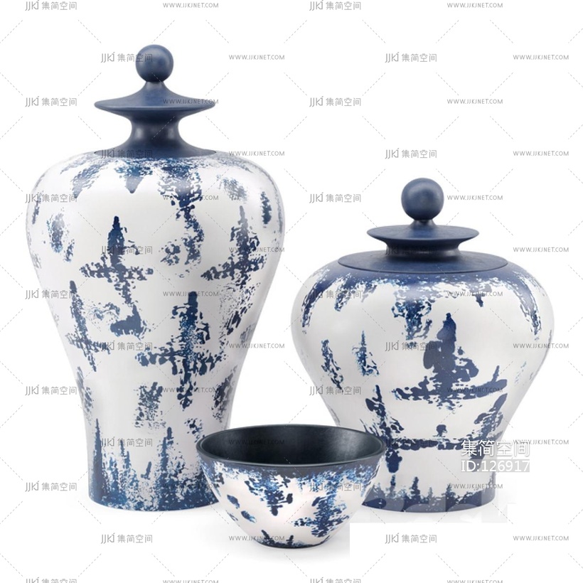 现代罐子_瓷器_陶罐_青花瓷花瓶_瓷器组合3D模型3d模型下载