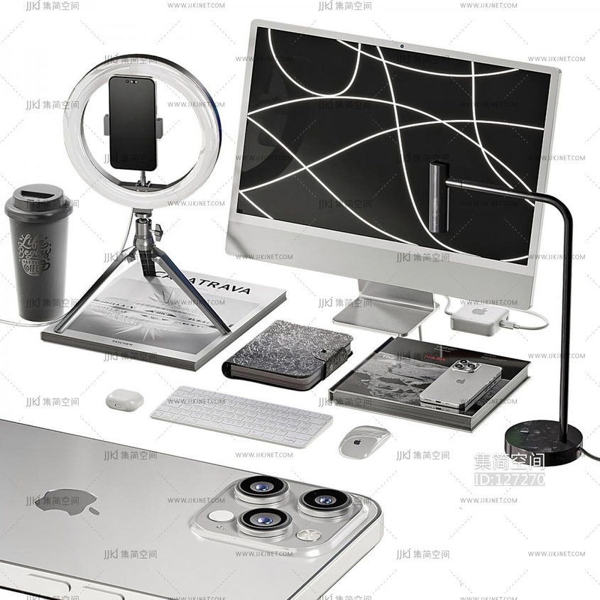 现代办公用品,一体机苹果电脑手机,键盘鼠标,直播背光灯设备 3d模型下载 [模型ID:127270]