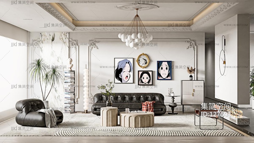 中古风客厅,美式客厅,圆形茶几,装饰画,移动电视,3d模型下载