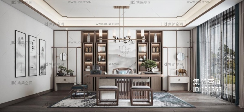 现代书房 书桌椅 壁柜 挂画 吊灯 书 盆栽 摆件3d模型下载