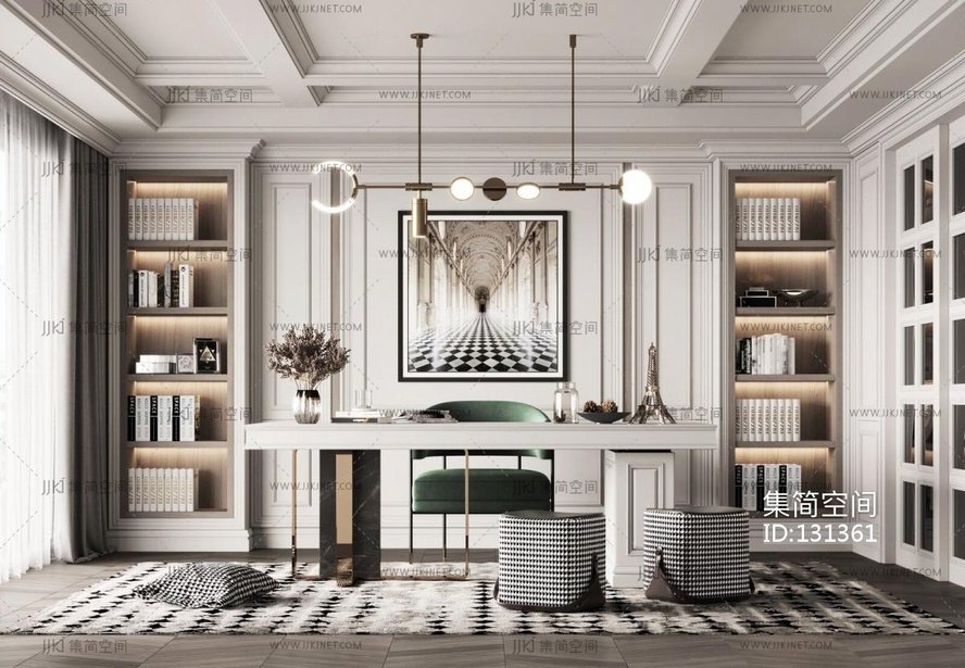 现代书房 书桌椅 壁柜 挂画 吊灯 书 盆栽 摆件3d模型下载