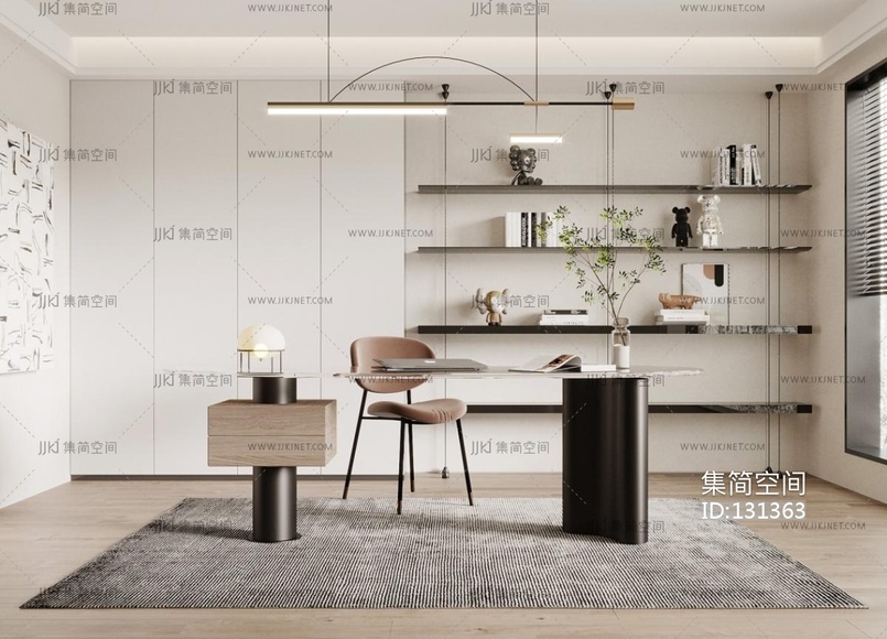 现代书房 书桌椅 壁柜 挂画 吊灯 书 盆栽 摆件3d模型下载