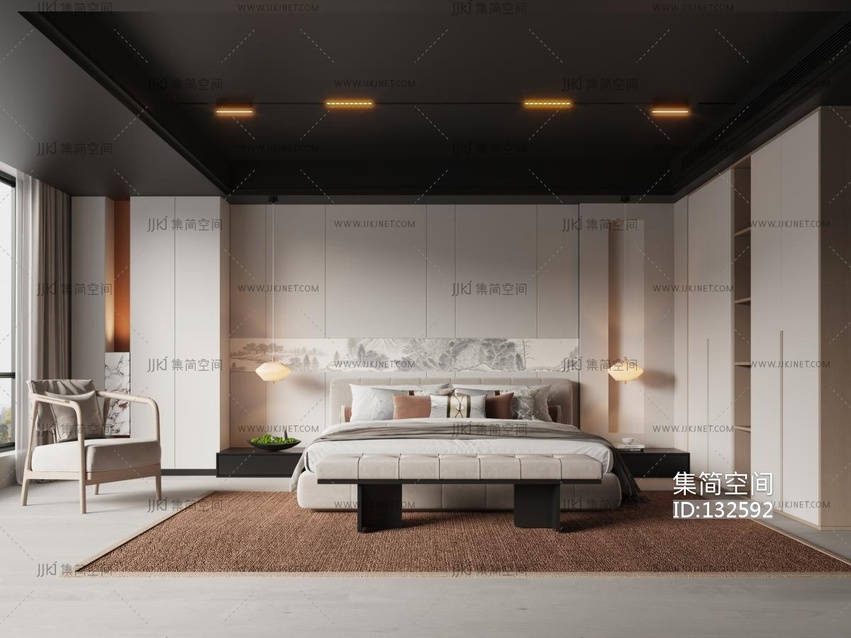 卧室,轻奢,暗黑风,现代轻奢卧室双人床,懒人沙发法式卧室3d模型下载