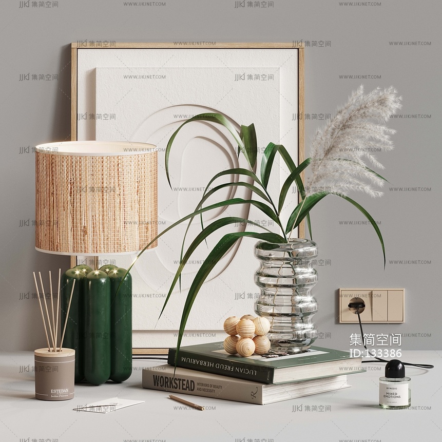 现代装饰摆件,台灯,玻璃花瓶,书籍 3d模型下载 [模型ID:133386]