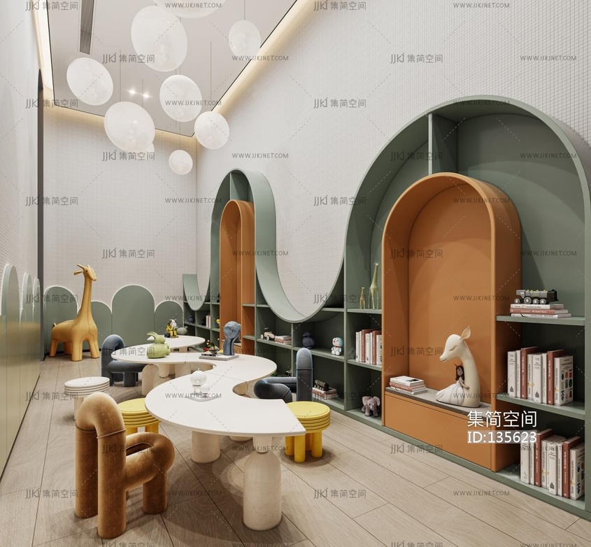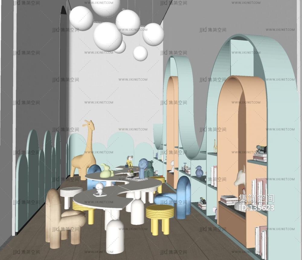 儿童活动室 培训机构,异形儿童桌椅椅子书柜su模型 su草图模型下载 [模型ID:135623]