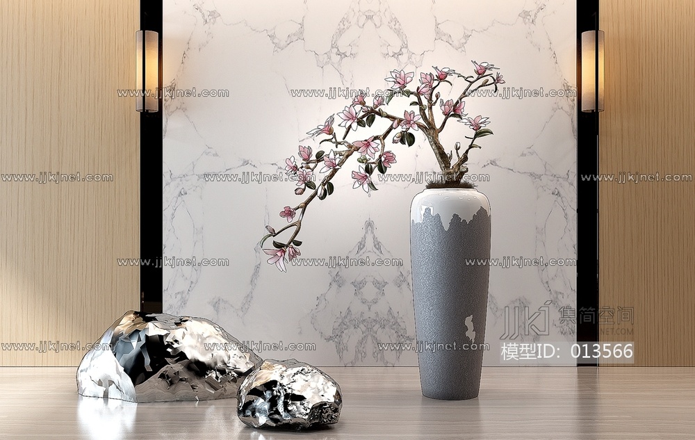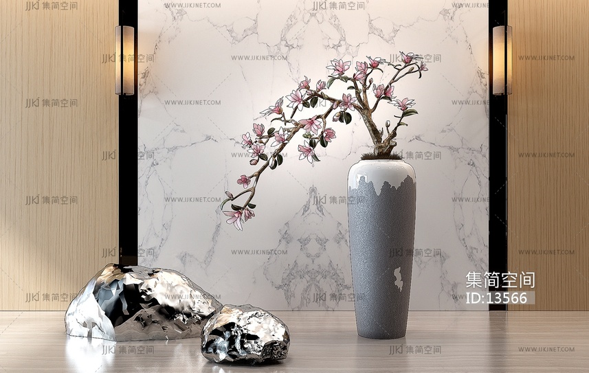 H09-1208新中式桃花落地盆栽花瓶罐子 3d模型下载 [模型ID:13566]