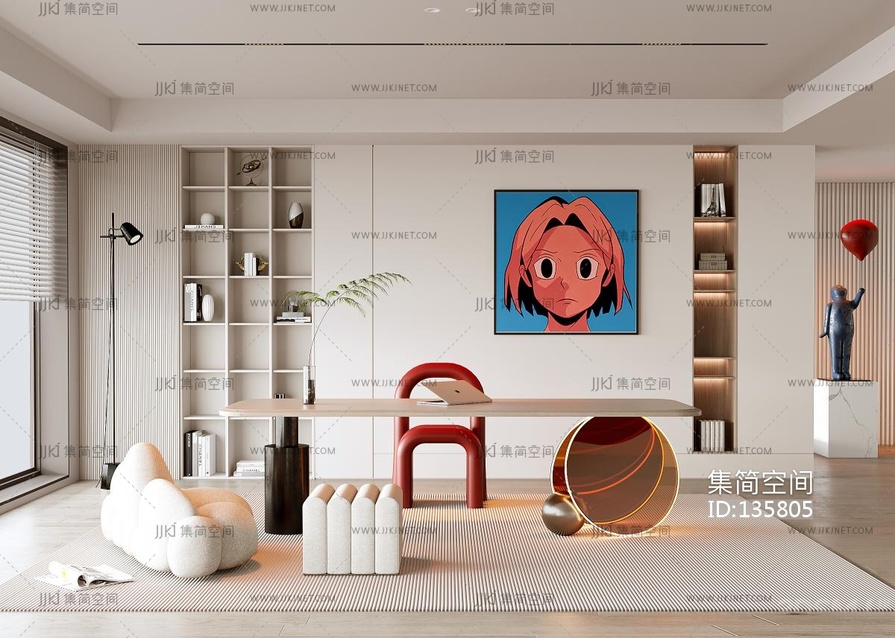 现代书房 书桌椅 壁柜 挂画 吊灯 书 盆栽 摆件3d模型下载