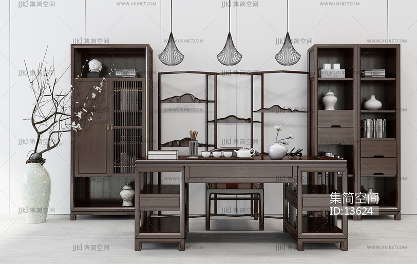 H32-1210新中式书房书柜桌椅组合屏风 3d模型下载 [模型ID:13624]