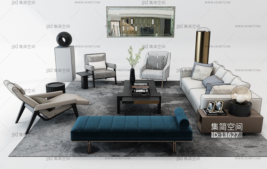 03-奶油中古沙发组合_沙发茶几组合_异形沙发_金属茶几_单人休闲椅_模块沙发3D模型3d模型下载