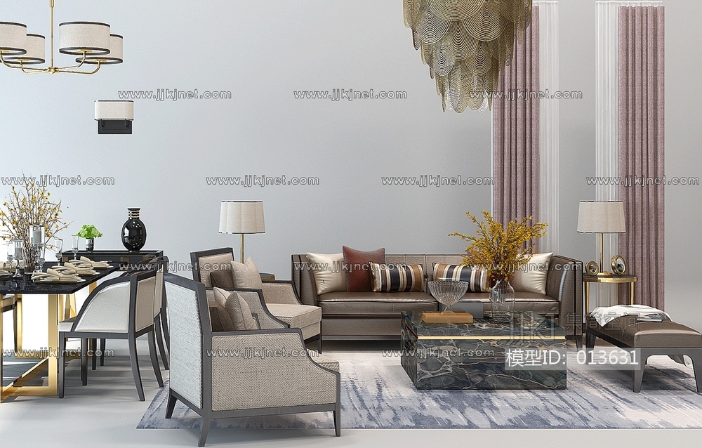 H40-1209新中式沙发茶几餐厅桌椅吊灯 3d模型下载 [模型ID:13631]