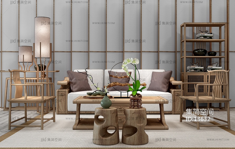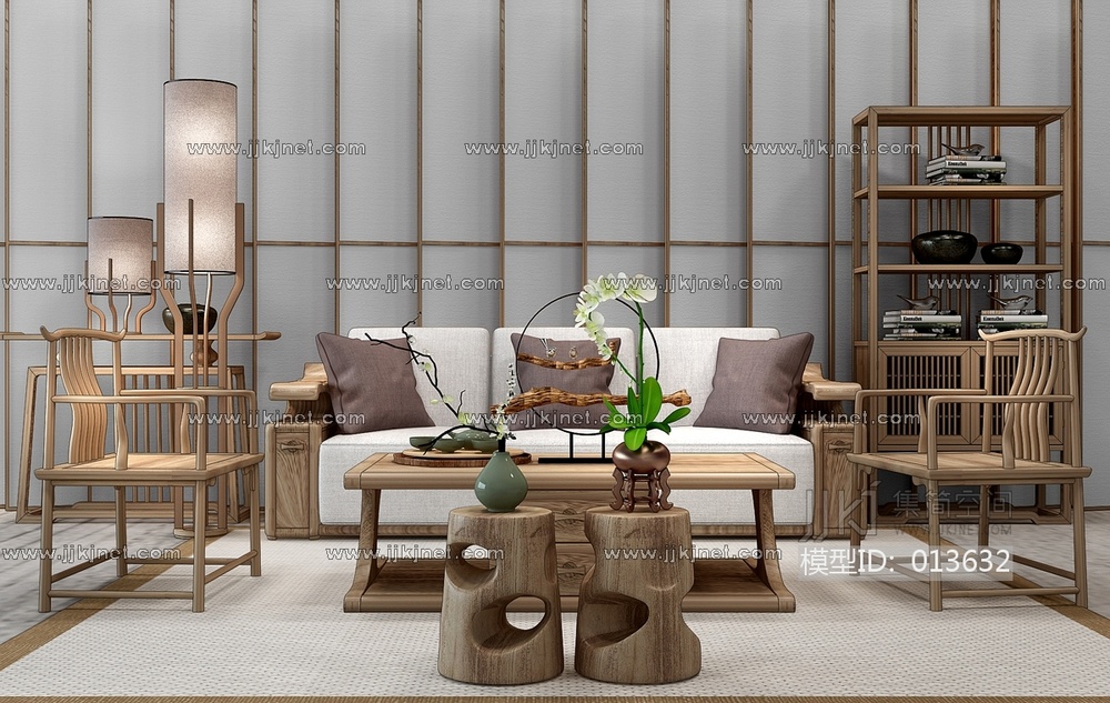 H41-1210中式沙发茶几书柜落地灯 3d模型下载 [模型ID:13632]
