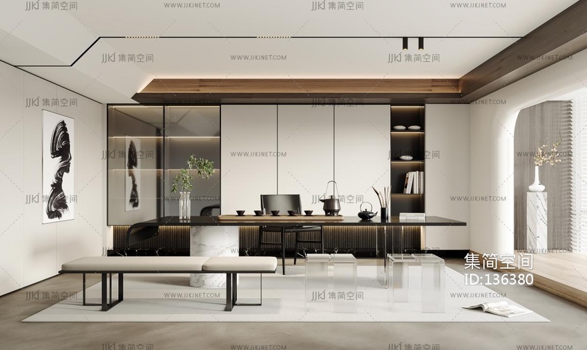 现代茶室茶桌椅茶台长条座椅座凳3d模型 3d模型下载 [模型ID:136380]