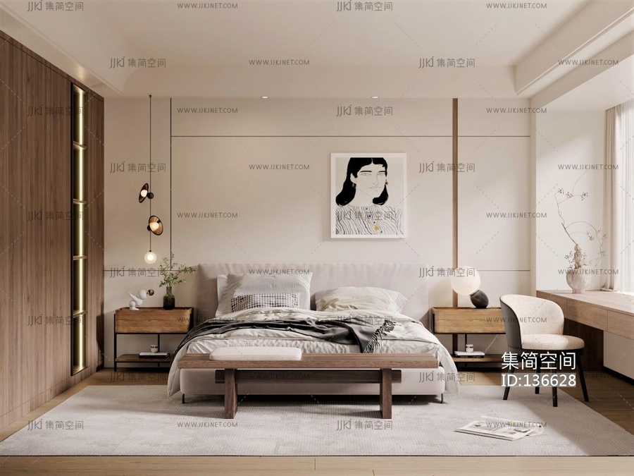 奶油原木风卧室SU模型su草图模型下载