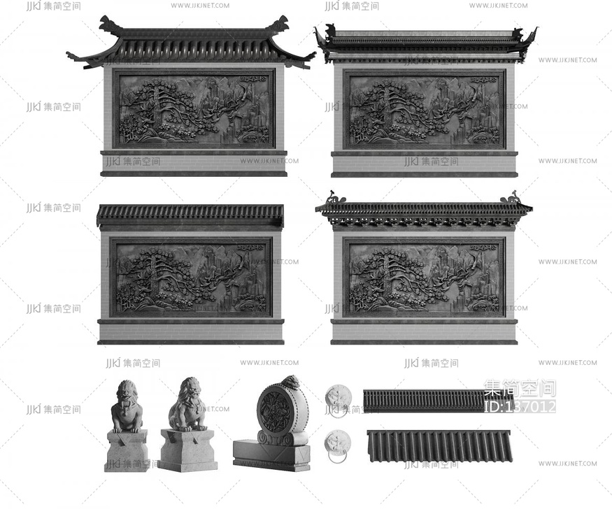 中式古建中式照壁,屋檐石鼓 3d模型下载 [模型ID:137012]