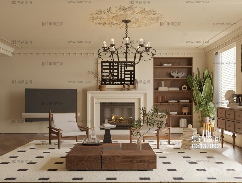 中古风客厅,美式客厅,圆形茶几,装饰画,移动电视,3d模型下载