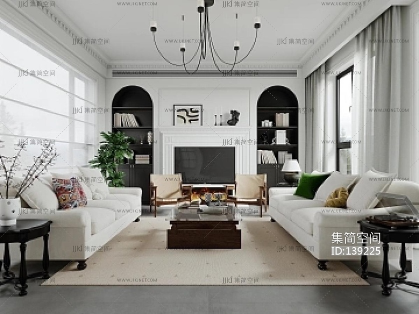 中古风客厅,美式客厅,圆形茶几,装饰画,移动电视,3d模型下载