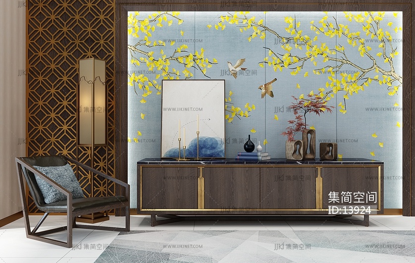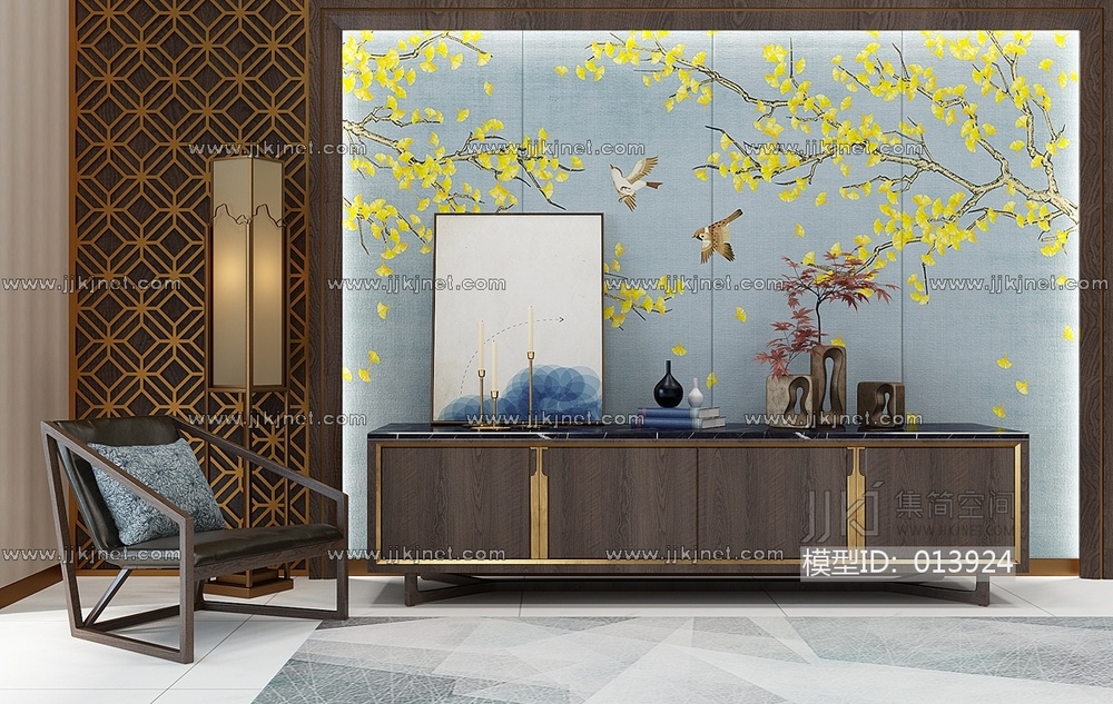 H08-1212新中式电视柜背景墙中式椅子花瓶摆件 3d模型下载 [模型ID:13924]
