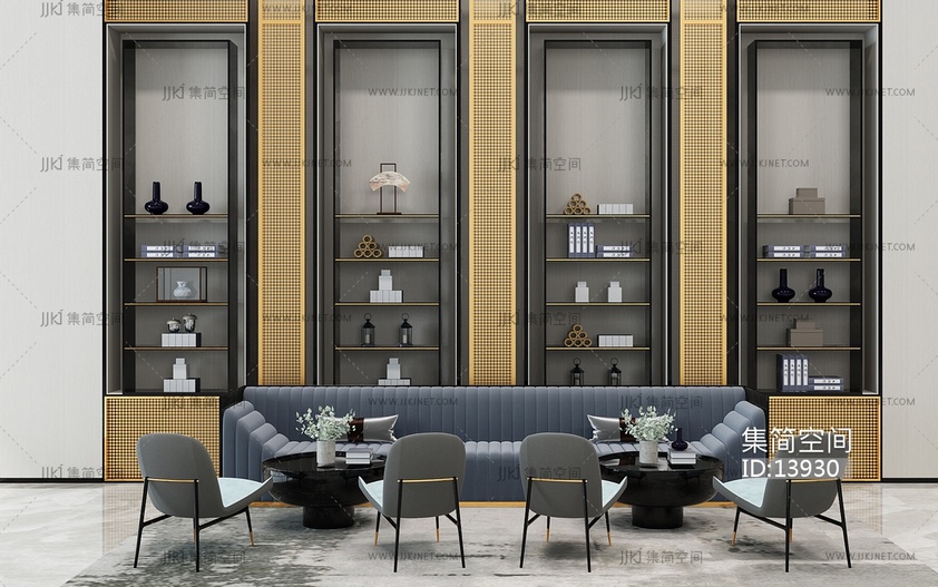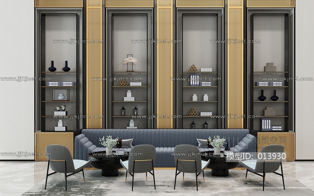 H29-1212新中式大堂休闲区沙发茶几组合书柜 3d模型下载 [模型ID:13930]