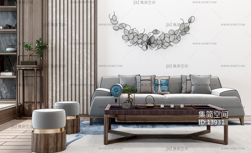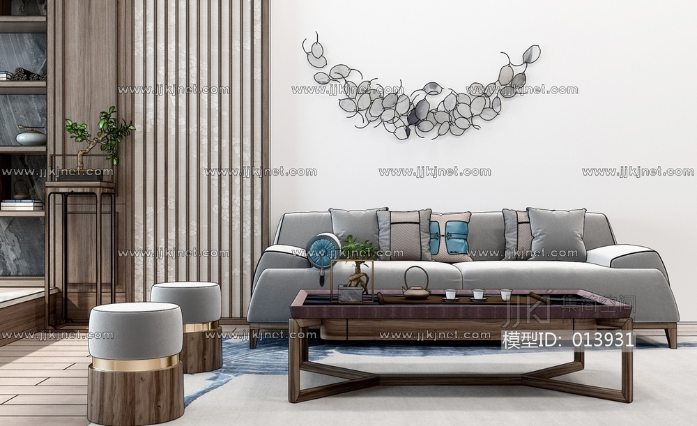 H31-1212新中式多人沙发茶几圆墩花架组合 3d模型下载 [模型ID:13931]