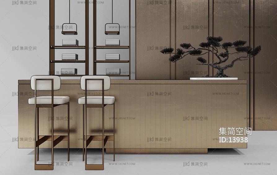 H46-1212新中式吧台吧椅接待台松树盆景 3d模型下载 [模型ID:13938]