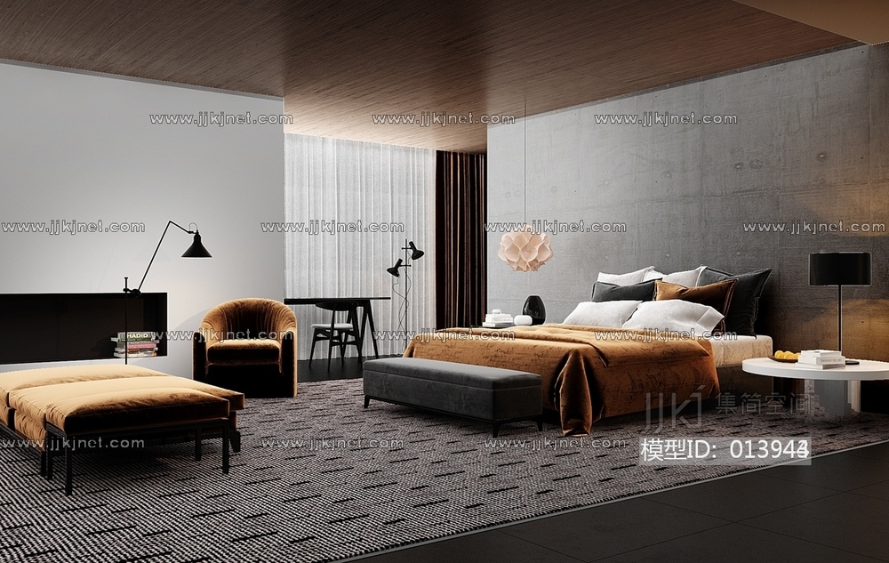 卧室,轻奢,暗黑风,现代轻奢卧室双人床,懒人沙发法式卧室3d模型下载