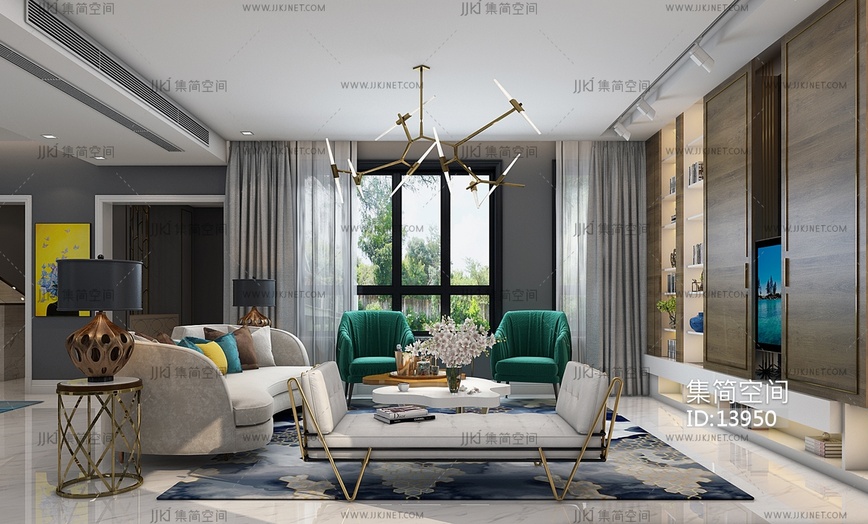 中古风客厅,美式客厅,圆形茶几,装饰画,移动电视,3d模型下载