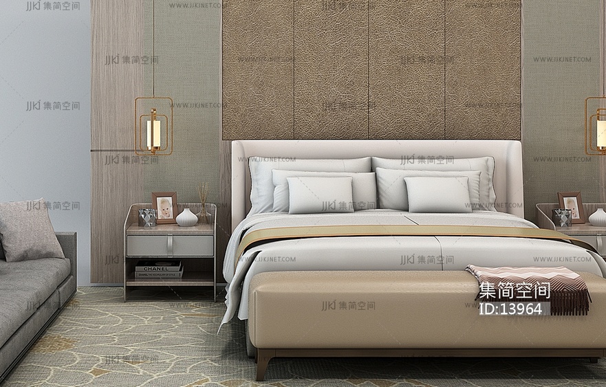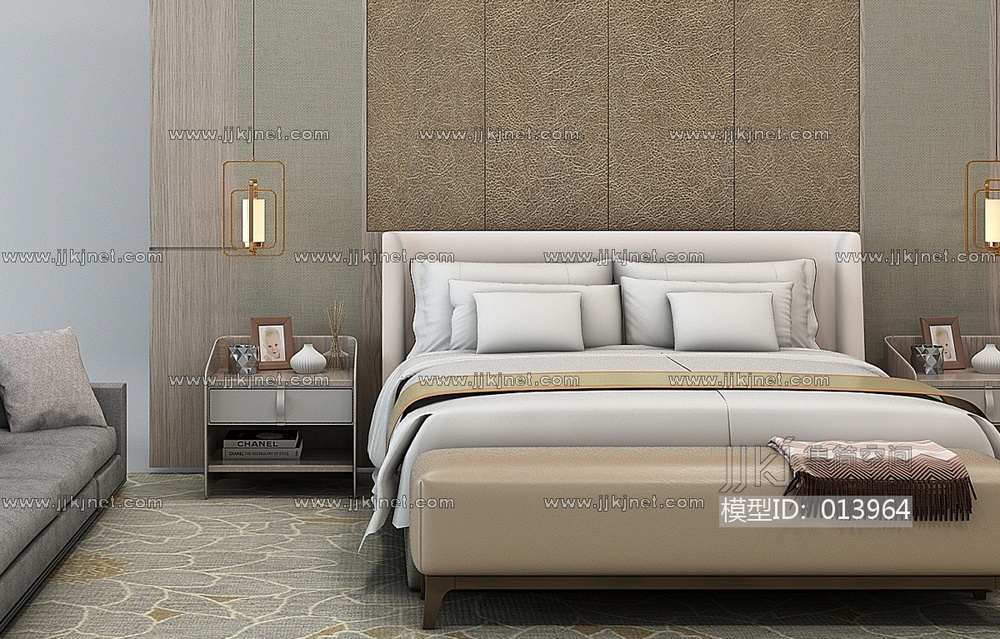 H25-1221新中式床床头柜床尾榻组合 3d模型下载 [模型ID:13964]