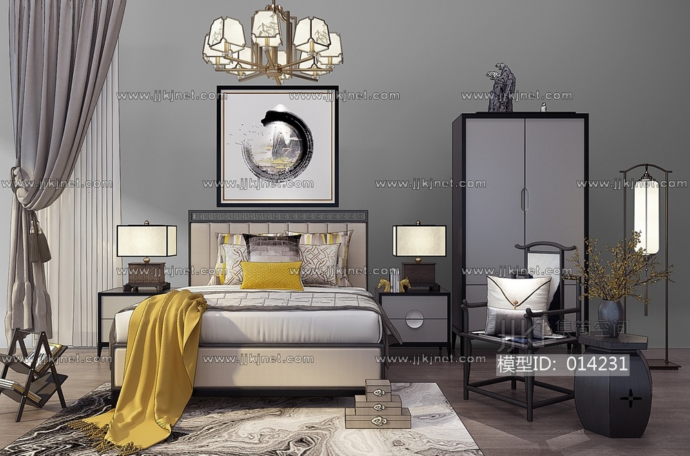 H02-1225新中式床头柜中式椅子边几毛毯落地灯 3d模型下载 [模型ID:14231]