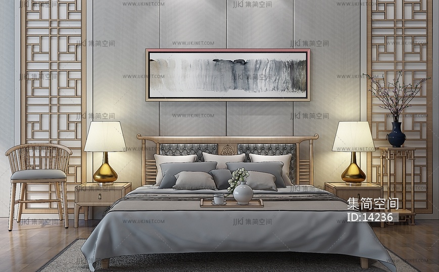 H07-1225新中式床床头柜组合 3d模型下载 [模型ID:14236]