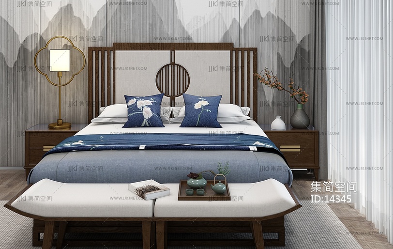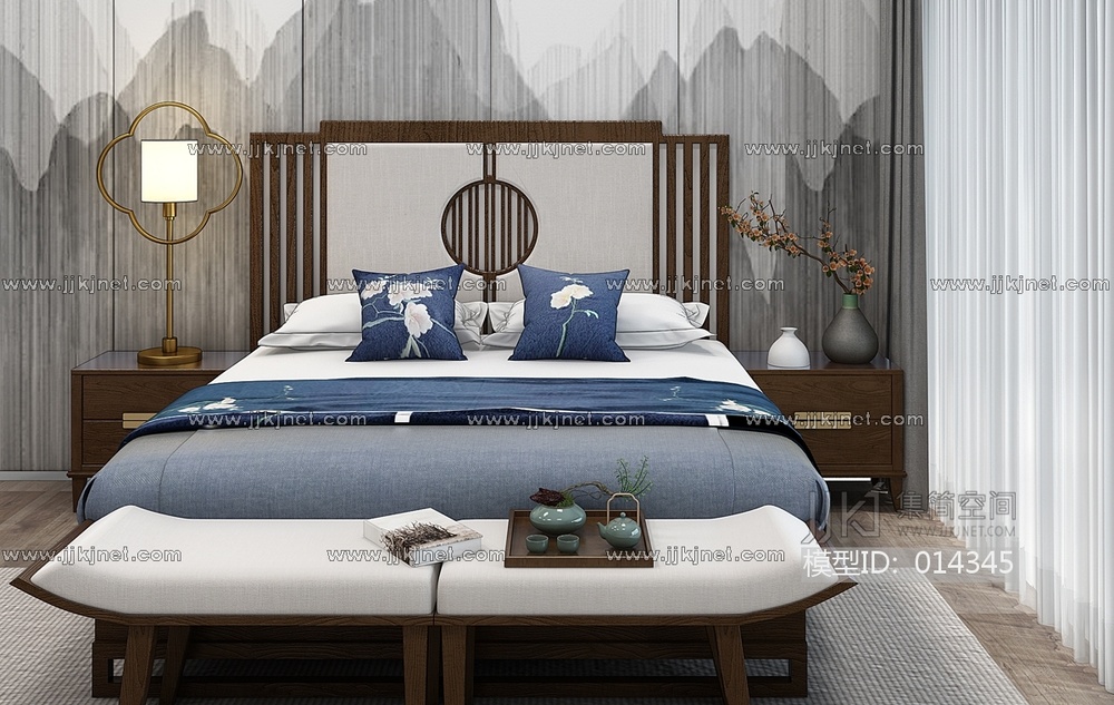 H18-1222中式床床头柜床尾榻凳 3d模型下载 [模型ID:14345]