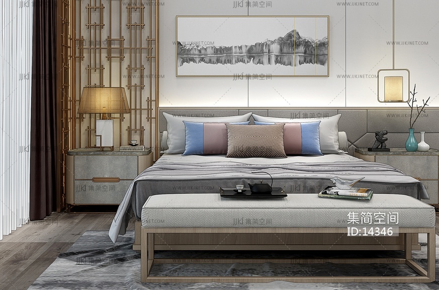 H19-1222新中式床床头柜床尾榻组合 3d模型下载 [模型ID:14346]