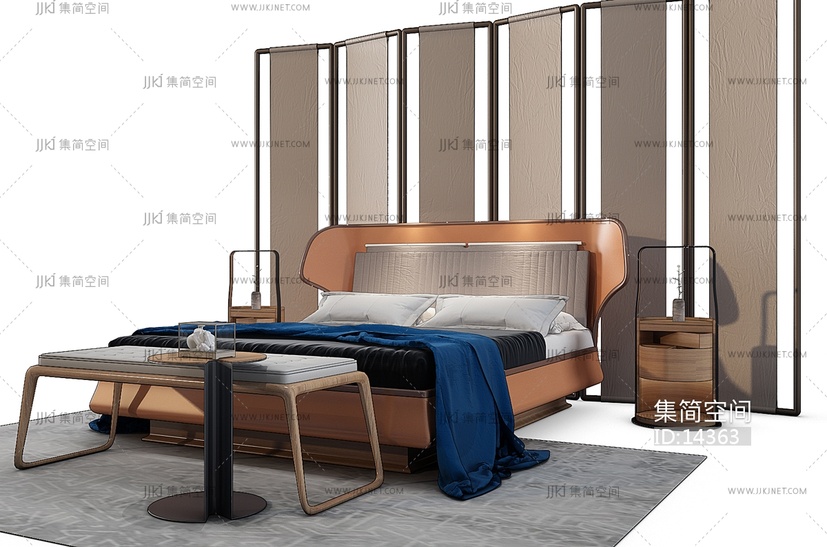 H09-1224新中式床床头柜床尾榻凳屏风 3d模型下载 [模型ID:14363]