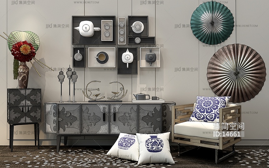 Z13-1209新中式装饰柜电视柜椅子花瓶中式立体画雨伞 3d模型下载 [模型ID:14661]