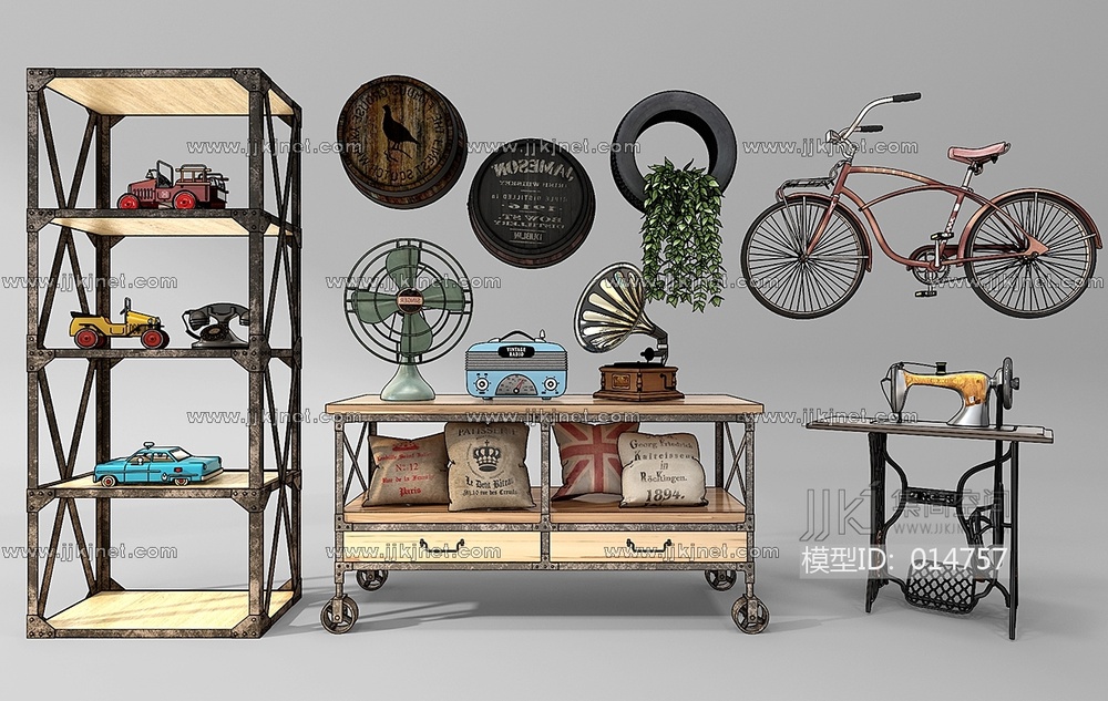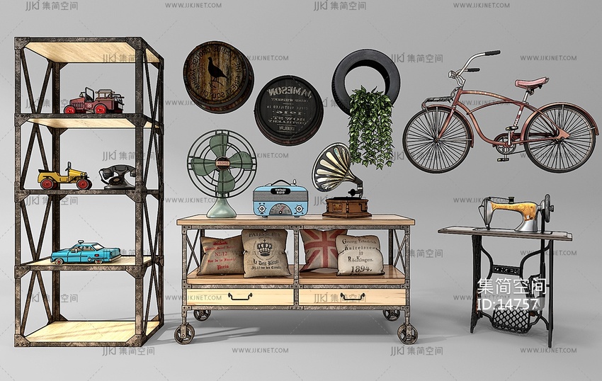 Z10-1213工业风装饰柜风扇自行车酒桶缝纫机留声机 3d模型下载 [模型ID:14757]