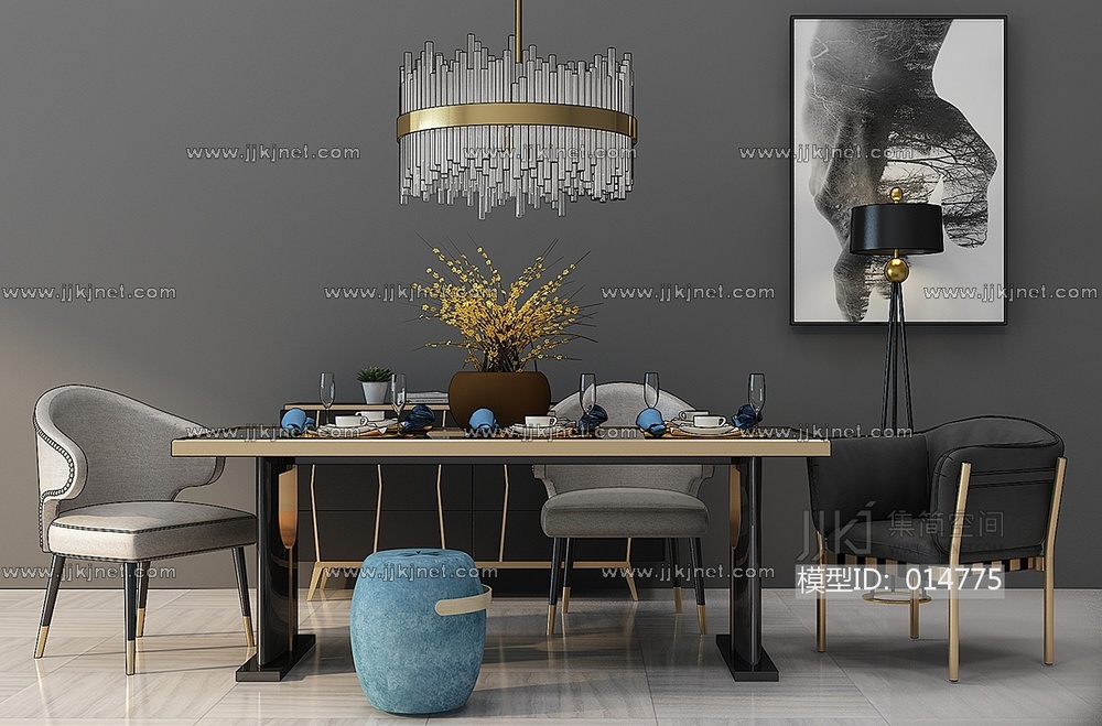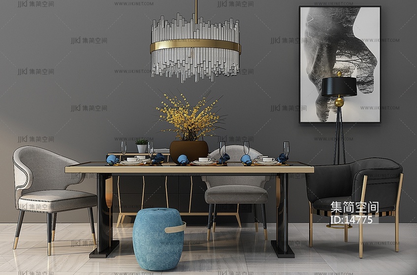 Z33-1213港式现代轻奢餐桌椅吊灯组合圆墩 3d模型下载 [模型ID:14775]