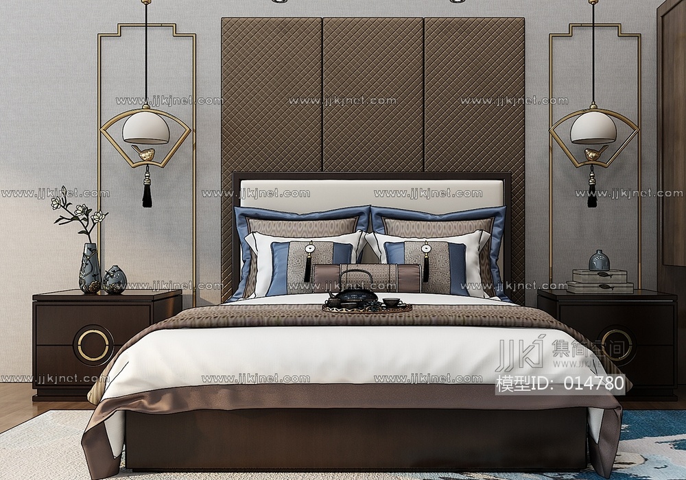 Z38-1213新中式床床头柜花瓶茶具吊灯组合 3d模型下载 [模型ID:14780]