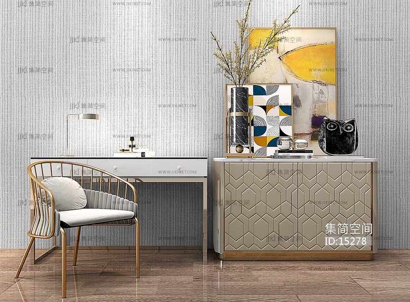 Z02-1221欧式装饰柜书桌椅写字台椅子花瓶组合 3d模型下载 [模型ID:15278]