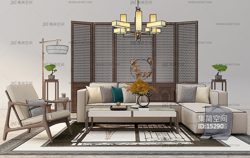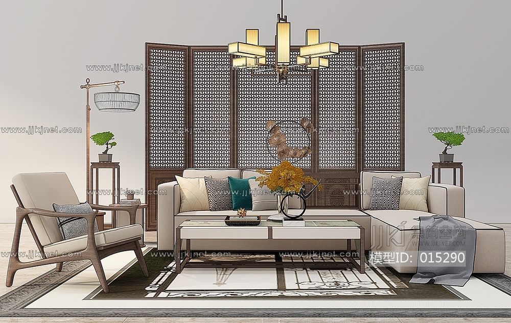 Z15-1221新中式布艺沙发茶几屏风落地灯花架组合 3d模型下载 [模型ID:15290]